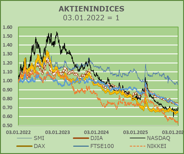 Solange Präsident Trump “frei nach seiner eigenen Meinung und Haltung” agieren und reagieren kann, bleibt der Ausblick kaum quantifizierbar. Folgerichtig setzen wir den Anlageschwerpunkt weiterhin auf den heimischen Aktienmarkt Schweiz, insbesondere unter Berücksichtigung der traditionellen Aufwertung der Heimatwährung und der dramatischen, zu erwartenden weiteren Abwertung des USD.