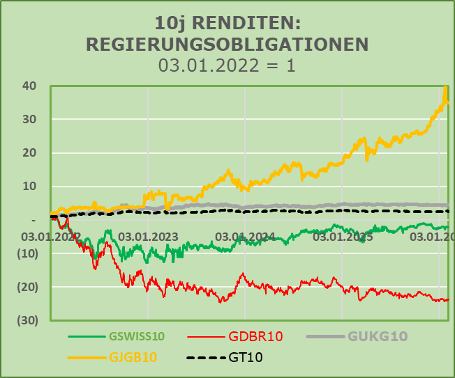 Wie bekannt, sind wir von diesem Ansatz nicht vollständig überzeugt. Klare Hinweise liefern die folgenden Grafiken, welche die indexierten Renditen 10-jähriger Staatsanleihen sowie ausgewählter bedeutender Aktienindizes in ihren jeweiligen Währungen für den Zeitraum seit dem 3. Januar 2022 darstellen.